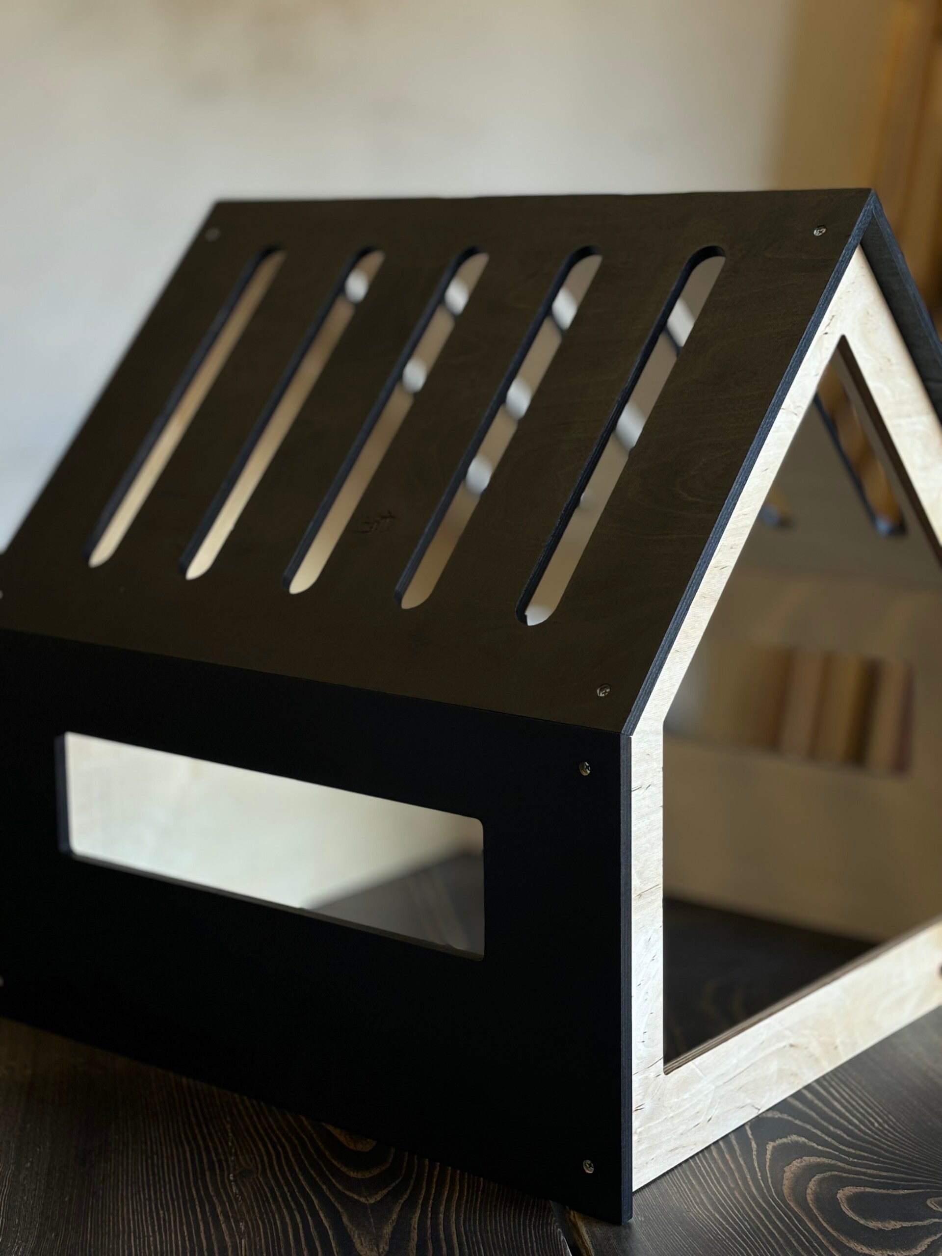 Moderni ja ilmava koirankoppi tyylikkäällä puumuotoilulla, ilmastusraidoilla ja sivuikkunoilla – täydellinen lepopaikka koirallesi sisäkäyttöön.